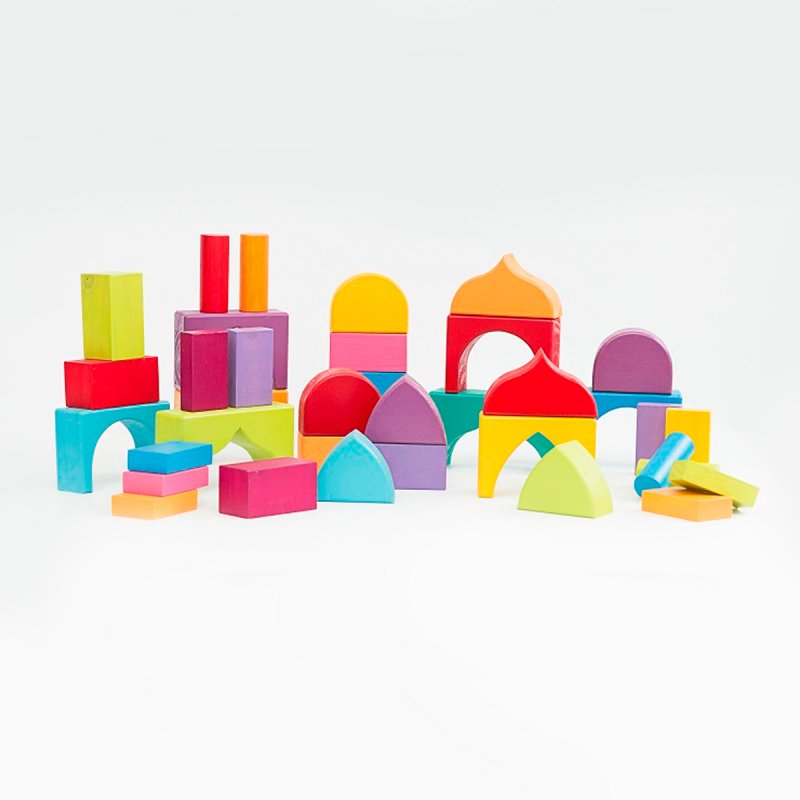 Otro de nuestros conjuntos para construcción y uno de los juguetes de madera más apreciados por su versatilidad y también por la belleza del material. Son 37 piezas inspiradas en formas orientales, de tamaño grande. Ideal para combinar con los arcos y otros juegos de bloques.